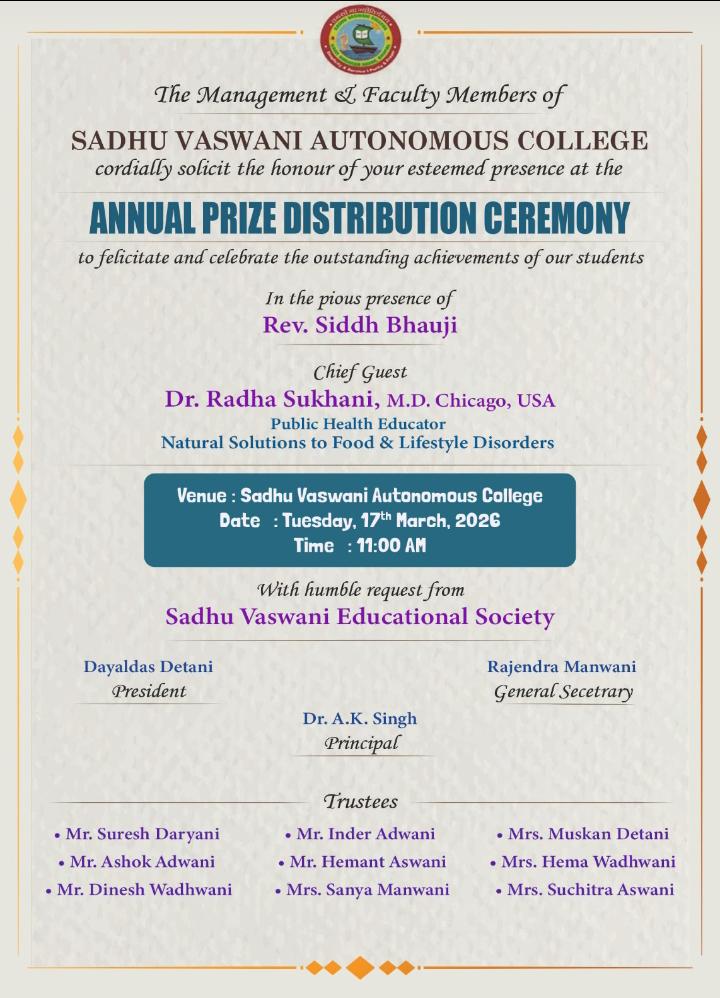 Sadhu Vaswani Autonomous College (Govt. Aided) is situated in the capital city of Bhopal. It is affiliated to Barkartullah University, Bhopal and also recognized by UGC under section 2(f) and 12(B) of the act. Since inception, the college has adopted an integrated and comprehensive approach of learning to achieve academic excellence and quality education.